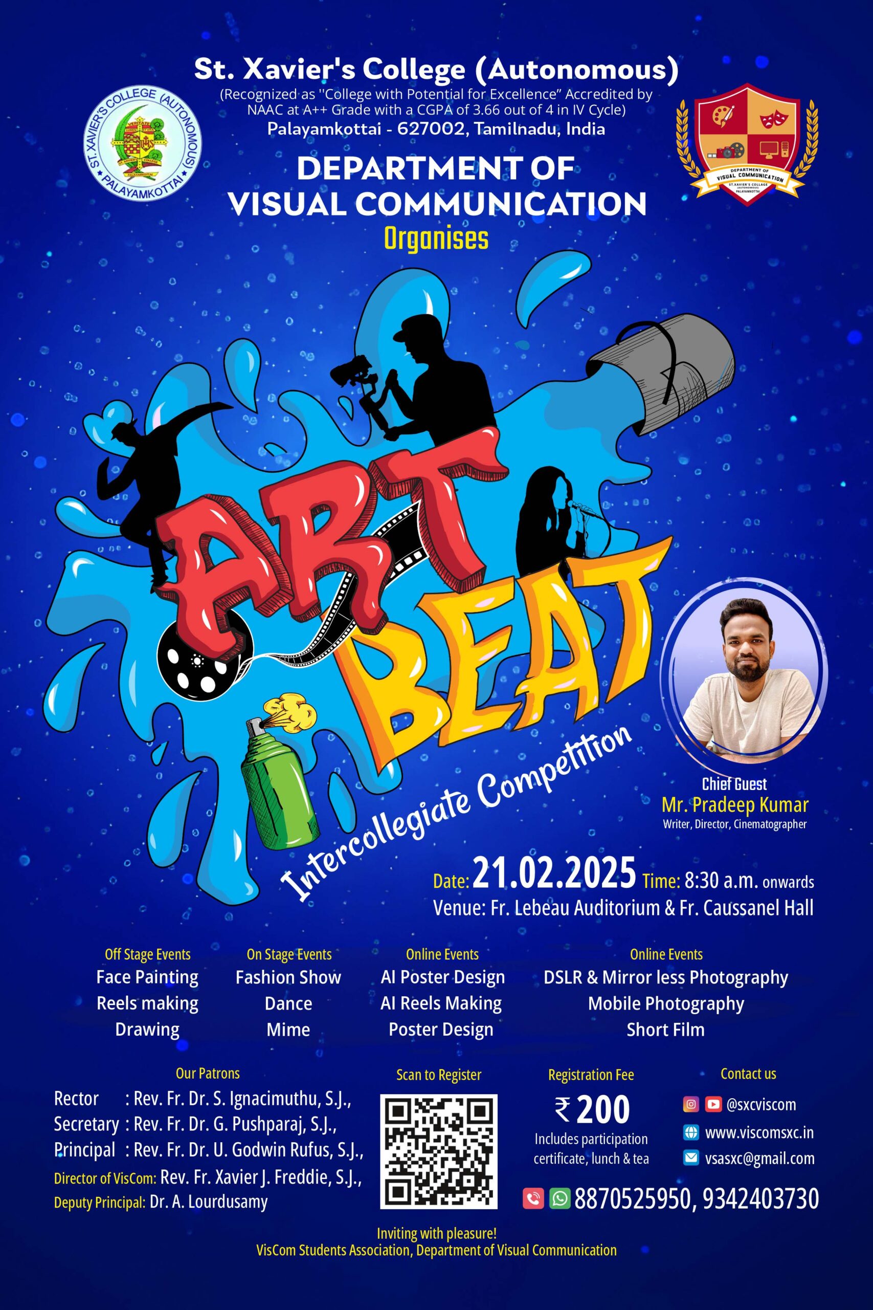 The Department of Visual Communication, St. Xavier’s College, Palayamkottai, is organizing "Art Beat" on 21st February 2025, featuring various off-stage, on-stage, and online events related to art and media. Mr. Pradeep Kumar (Writer, Director, Cinematographer) is the Chief Guest. The event encourages students' creativity through competitions in filmmaking, photography, poster design, and more.