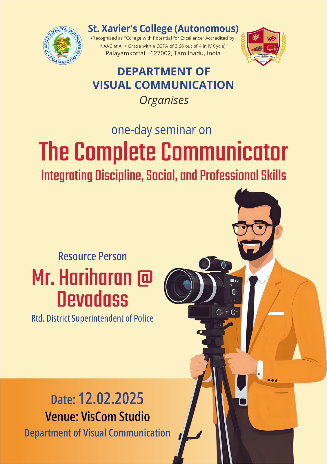 The Department of Visual Communication at St. Xavier’s College (Autonomous), Palayamkottai, is organizing a one-day seminar on "The Complete Communicator: Integrating Discipline, Social, and Professional Skills."