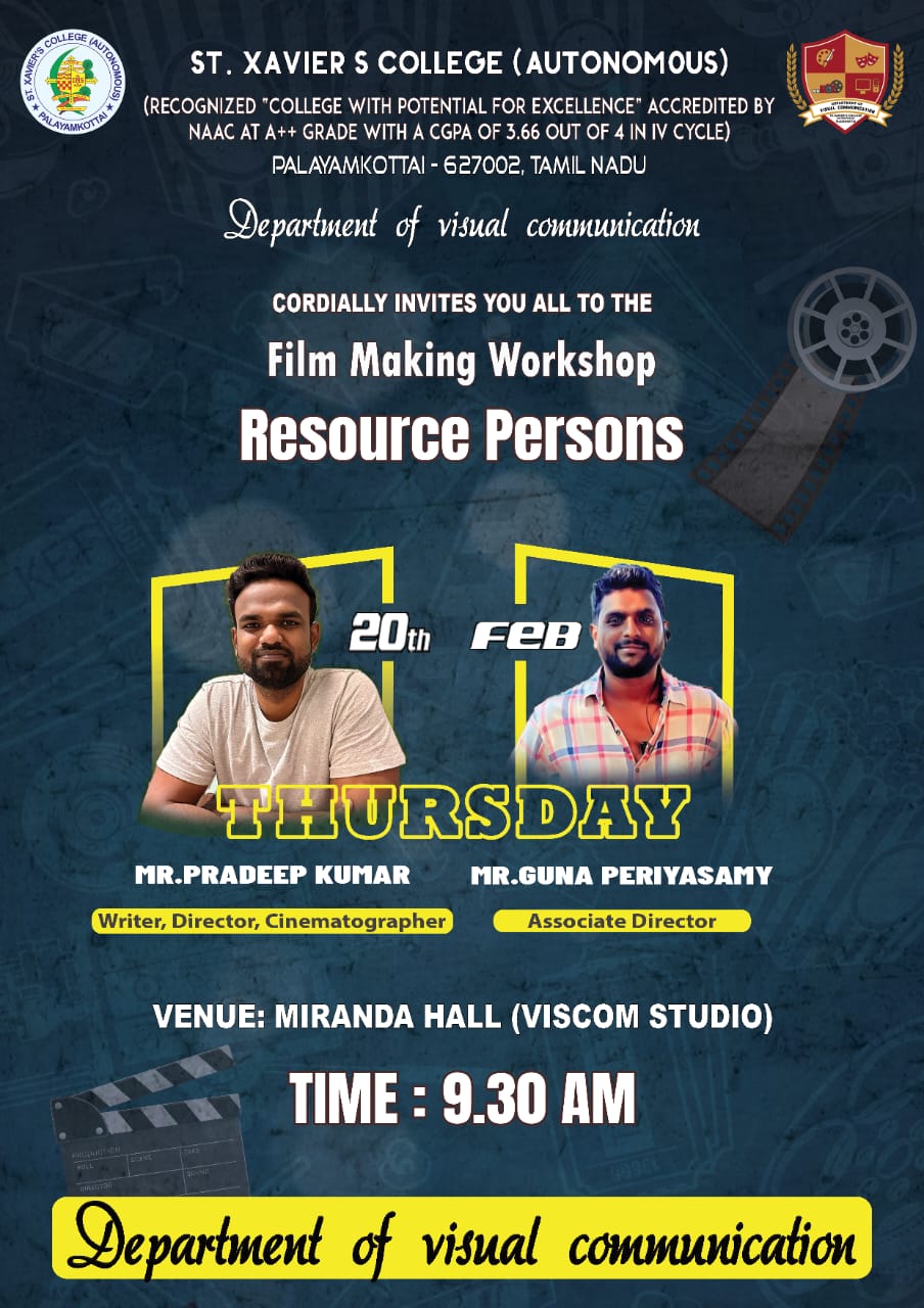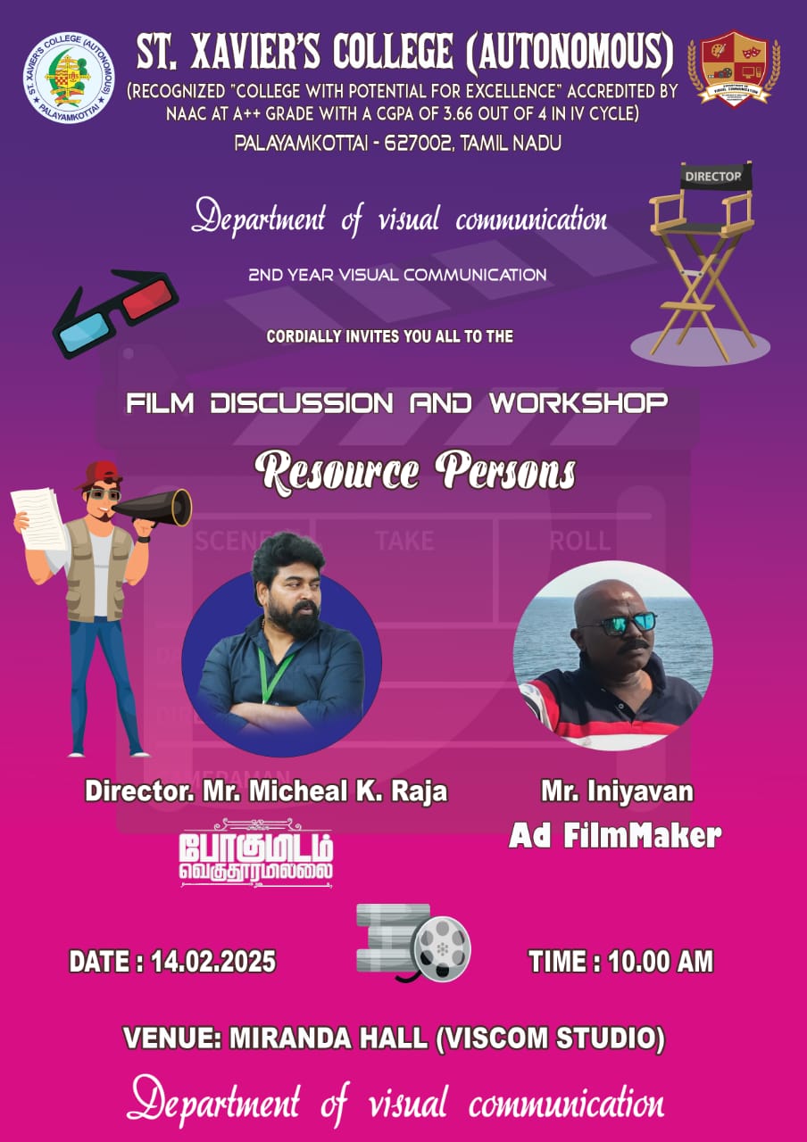 The Department of Visual Communication at St. Xavier’s College (Autonomous), Palayamkottai, is organizing an exclusive Film Discussion and Workshop with Director Micheal K. Raja for 2nd & 3rd-year Visual Communication students.